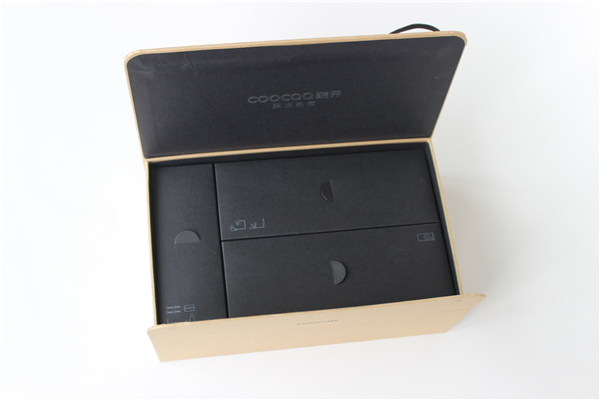 盒多數(shù)牛皮紙包裝一樣,這款包裝并沒有印刷太多的圖案,只是在皮殼上印有創(chuàng)維酷開的logo圖案,單色印刷簡潔素雅,十分大方。